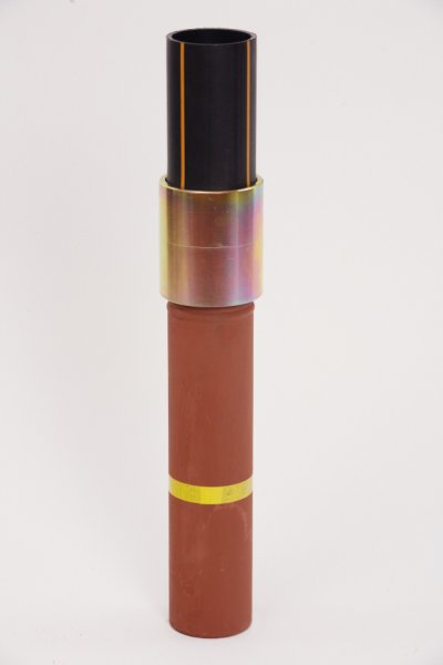 Přechodový spoj ocel/PE 100, PE 100-RC - zemní provedení (zemní přechodka-propojovací) je dílensky vyrobený nerozebiratelný spoj určený k vzájemnému spojení kovové a plastové části potrubí tlakového rozvodu topných plynů (zemní plyn,svítiplyn, plynná fáze propanu, vodík) s maximálním pracovním přetlakem 0,4 MPa. Uvedené výrobky odpovídají ČSN EN 1555-3.